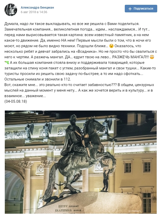 «Несколько ребят и девчат забрались на „Всадника“. Но не просто чтобы свалиться с него к чертям. А разжечь мангал. А их большая компания стояла внизу и поддерживала товарищей, которые затащили на спину коня пакет с углем, разобранный мангал и свои тушки… Какие-то туристы просили их решить свою задачу побыстрее, а то им надо сфоткать», — сообщила девушка на своей страничке «ВКонтакте».
