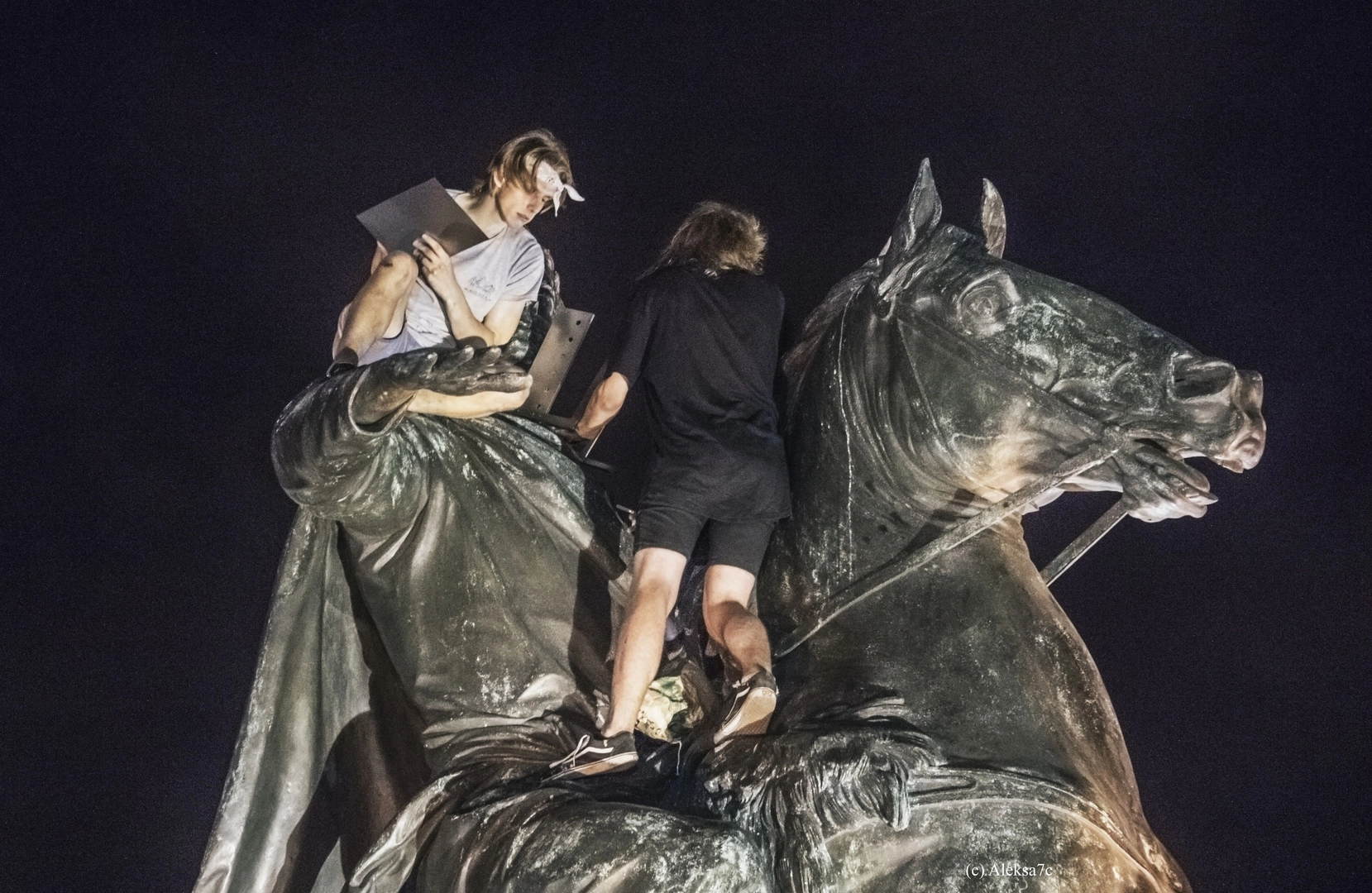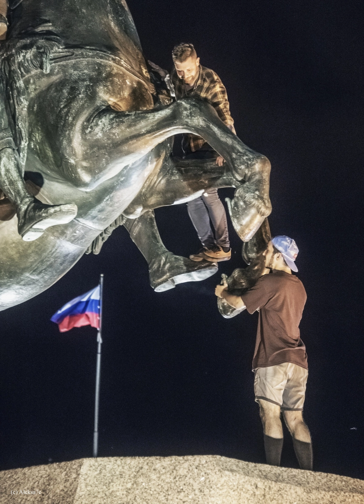 На прикрепленных к записи фотографиях отчетливо видны лица «штурмующих» Медного всадника людей. Судя по кадрам, побывать на памятнике удалось как минимум троим хулиганам, еще двое были запечатлены стоящими на его постаменте.