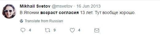 Ранее некоторые СМИ обсуждали нездоровый интерес Светова к несовершеннолетним девочкам. Журналисты писали, что он не раз оправдывал педофилию, а также критиковал установленный в УК «возраст согласия» (16 лет).