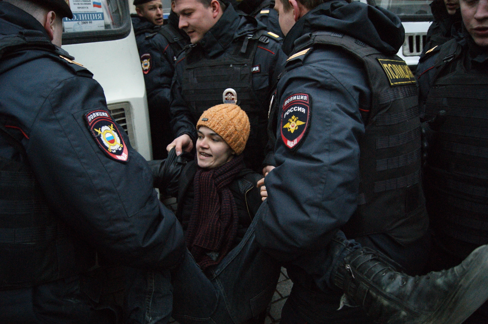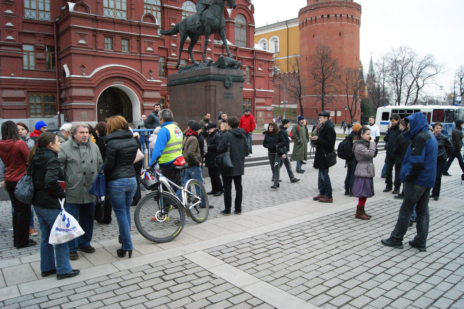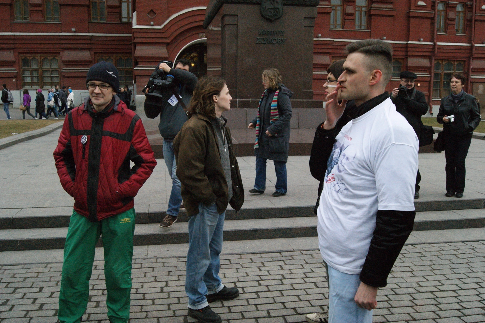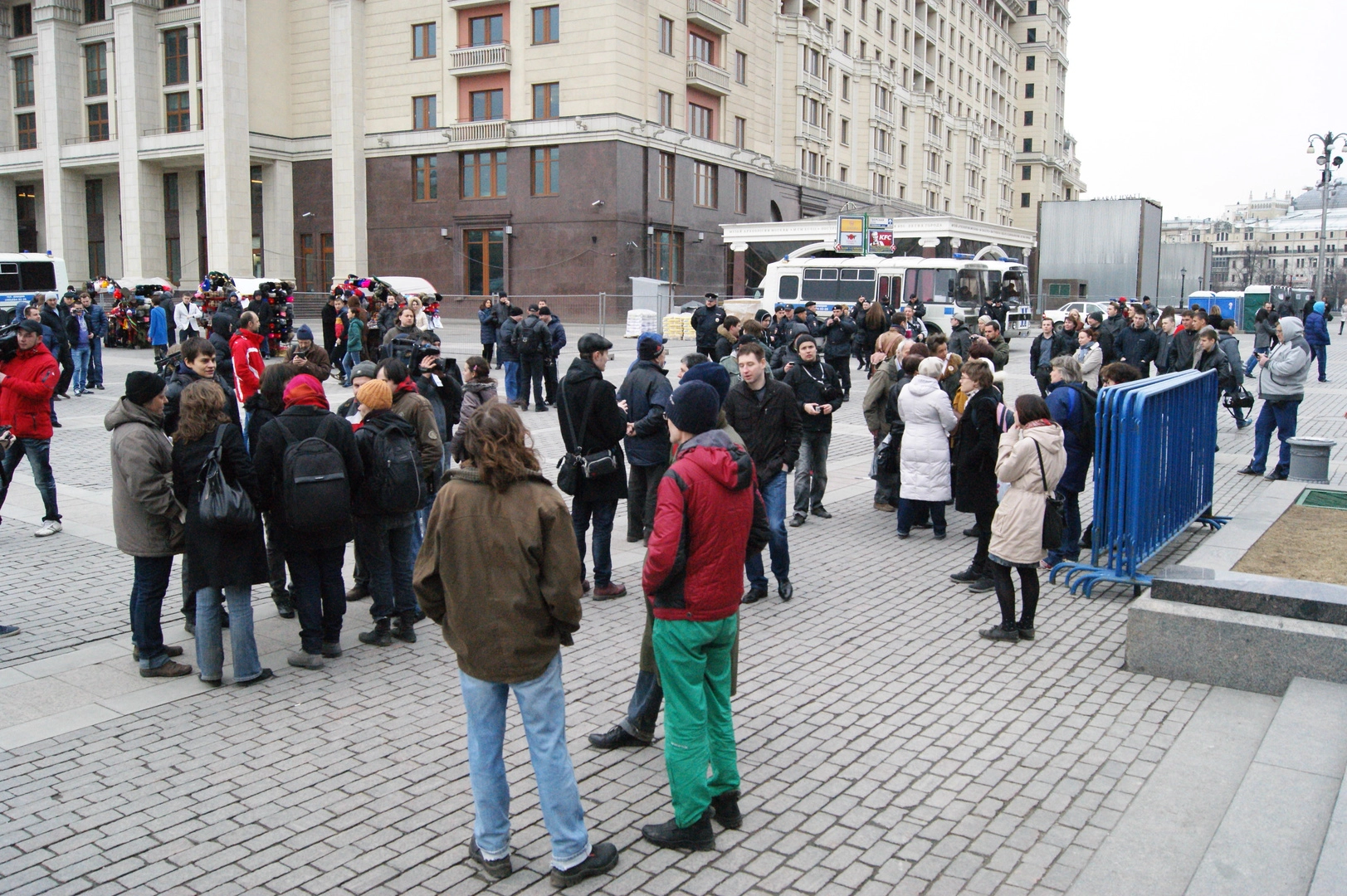 Всего к Манежной площади вышли не более 40-50 человек. Полиция сразу начала задержания тех, кто развернул плакаты, попутно задерживая других активистов, которые вступались за задержанных. Всего около Манежной площади в течение часа были задержаны 12 человек.