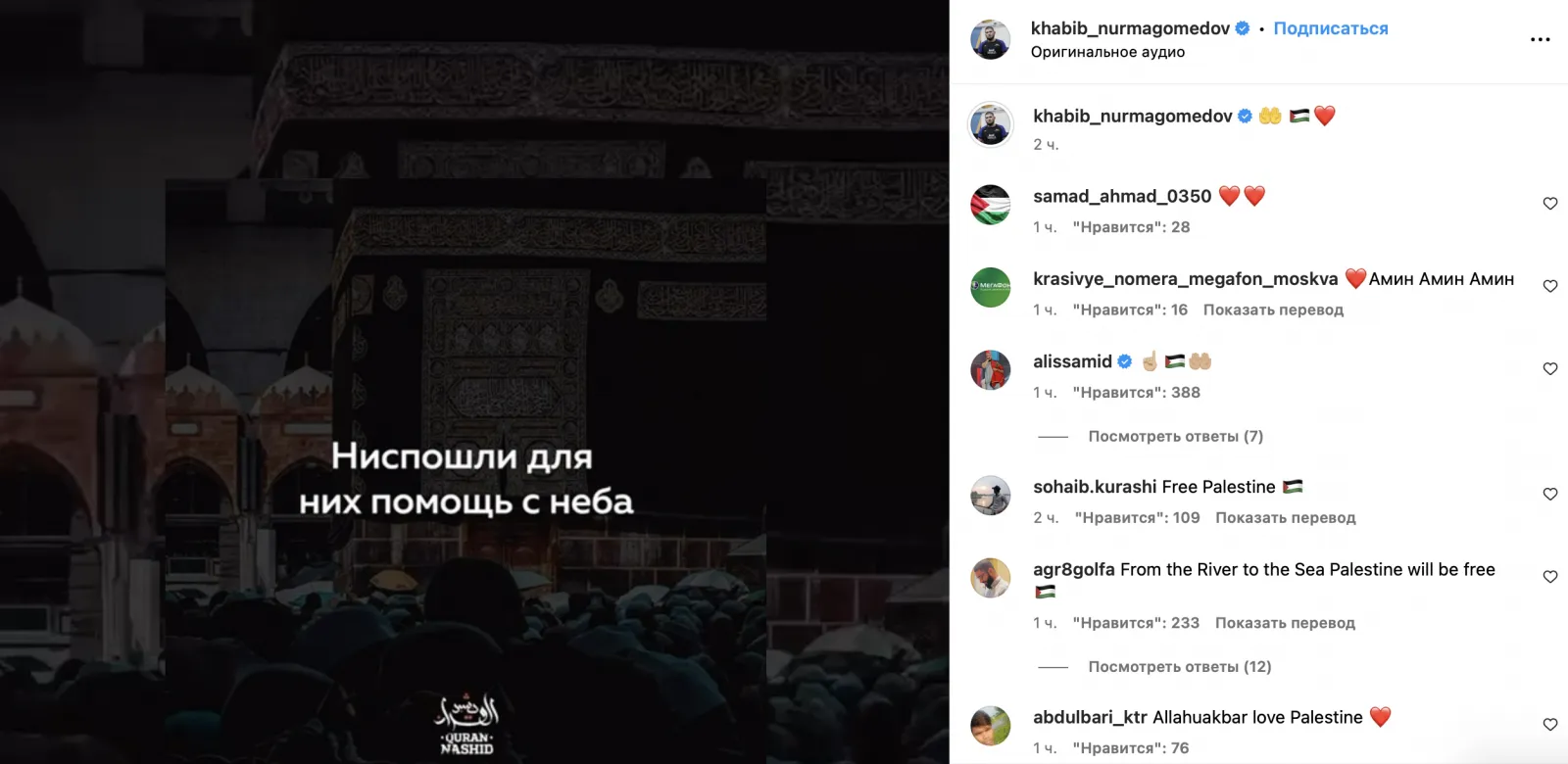 Палестину активно поддерживает и экс-чемпион UFC в легком весе Хабиб Нурмагомедов. В соцсетях он написал: «Ниспошли для них помощь с неба». Публикация была проиллюстрирована флагом Палестины, красным сердцем и символизирующим солидарность эмодзи, к ней было прикреплено видео с цитатами из Корана.