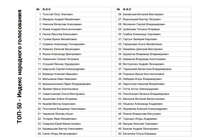 По критерию народного голосования три первых места заняли вице-спикер Петр Толстой (ЕР), глава комитета по бюджету и налогам Андрей Макаров (ЕР) и глава комитета по образованию и науке Вячеслав Никонов (ЕР).