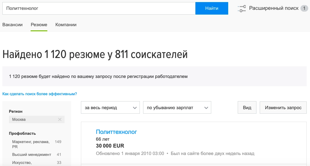 Ваш кандидат заслуживает лучшей в мире кампании, поэтому после ввода «политтехнолог» в поиске резюме стоит отсортировать кандидатов по убыванию зарплатных ожиданий. Так вы будете уверены, что имеете дело с настоящими профессионалами с десятками кампаний за плечами, а не с неопытными выпускниками профильных вузов.