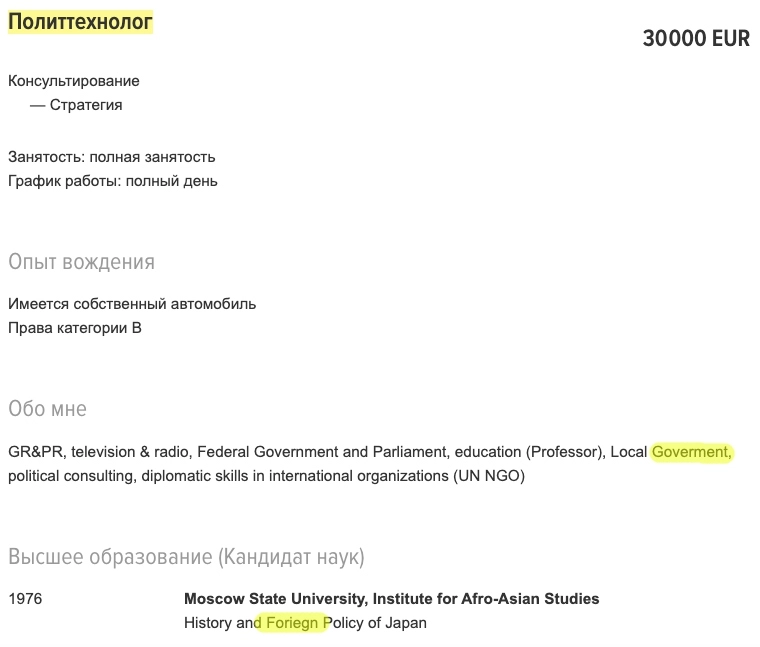 Обращаем внимание, что самый высокооплачиваемый политтехнолог совершил ошибку в английском написании факультета своей альма-матер и поспешил при наборе слова «Government» — и переходим к следующему соискателю.