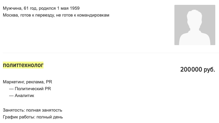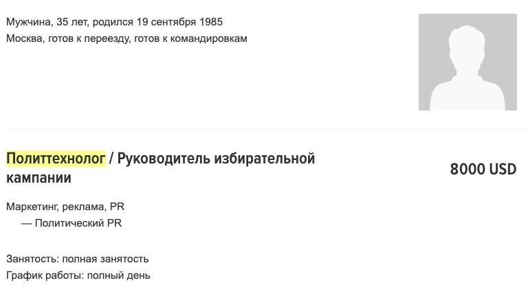HeadHunter, очевидно, неподходящий ресурс для этой профессии, продолжает Баширов. По его словам, в работе политтехнологов главным является вопрос доверия: