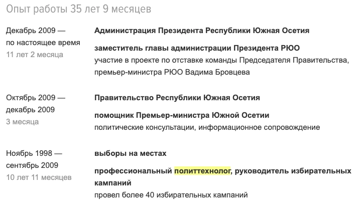 Согласно резюме, в октябре 2009 года этот специалист пару месяцев проработал в правительстве Республики Южная Осетия — помогал премьер-министру с политконсультациями и информационным сопровождением.