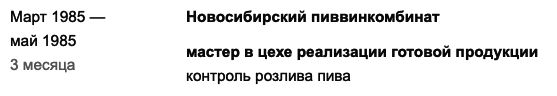 Не исключено, что этот навык соискатель приобрел еще на первом месте работы — в Новосибирском пиввинкомбинате, где контролировал розлив пива в цехе реализации готовой продукции.