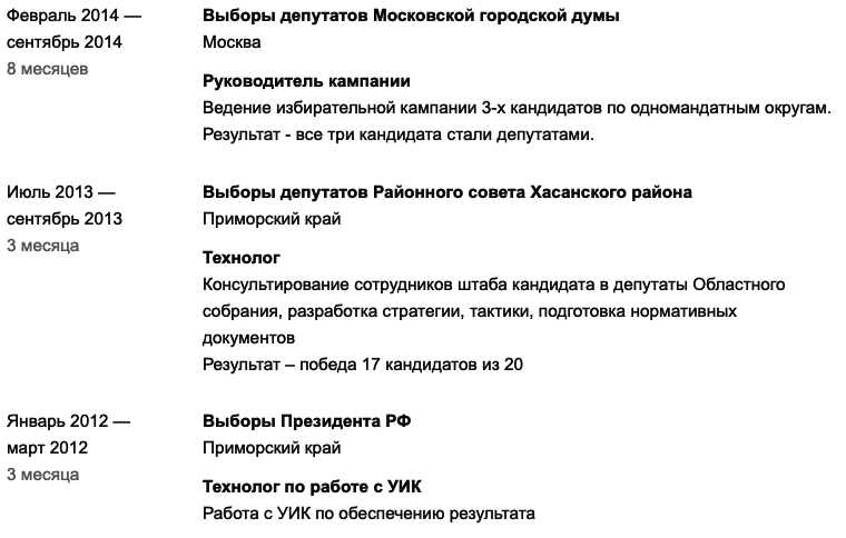 Уважаемые заказчики! Если вы видите перед собой резюме политтехнолога с подробнейшим указанием всех мест работы, проектов, заказчиков и достигнутых успехов — вежливо поблагодарите его и сделайте выбор в пользу другого соискателя.