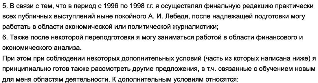 Может быть, вам хотелось бы нанять специалиста, который «осуществлял финальную редакцию практически всех публичных выступлений ныне покойного А. И. Лебедя»? Резюме этого политтехнолога тоже есть на сайте — он поможет прокачать качество речей вашего кандидата за две с половиной тысячи долларов в месяц.