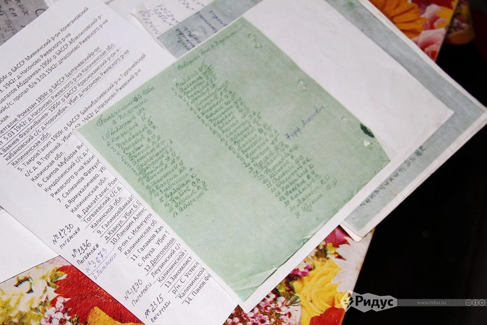Вот схемы захоронения. Я нахожу их. Вот. Захоронено строго шесть человек, ошибки быть не может, что это они. А это — номера, под которыми они уже числятся в деревне Погорелки, якобы перезахоронены в пятидесятые годы. Спрашивается: зачем тела везти во Ржев? Это надо переделывать все документы, все книги памяти. Родные все знают, что они похоронены в деревне Погорелки, вот номера, вот свидетельства, вот доказательства. Та же самая картина по другим. Вот яма, схемы нет, смотрим, кто захоронен. Башкиры практически одни. Смотрим по номерам: подчеркнутые, уже числятся в деревне Погорелки. Что творим, вообще непонятно. Зачем везти за 40 километров, если они числятся уже здесь?! спрашивает Виктор Морозов.