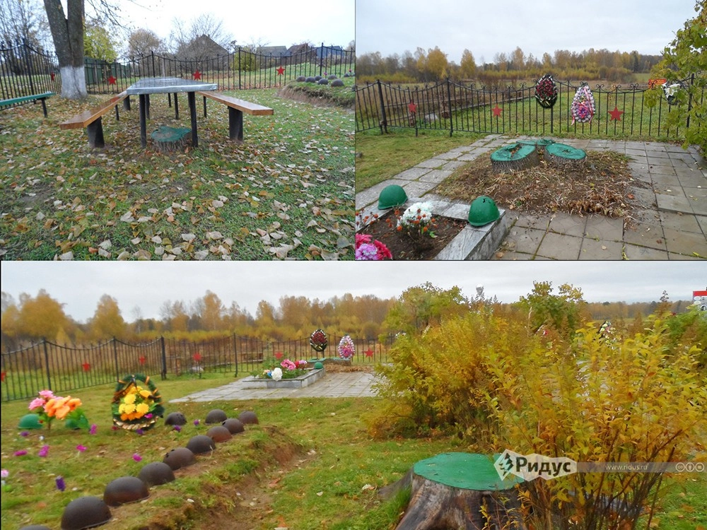 При пристальном рассмотрении тендер этот выглядит весьма интересным. Дорожки из плит, газоны и кустарники на кладбище появились, спору нет. С деревьями же и пнями картина выглядит несколько иначе. Во-первых, по словам Морозовых и их односельчан, на воинском кладбище росло всего пять деревьев, да и те были спилены и вывезены с территории мемориала силами Виктора и его сына Александра. Выкорчеванные же по документам пни находятся на своих местах и по сей день. Вот они, все пять, на фотографиях.