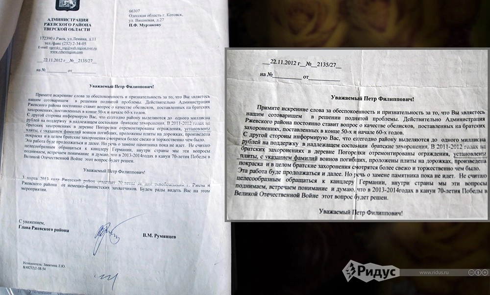 «Отряд „Память“ с согласия администрации района перезахоранивал останки найденных воинов времен ВОВ в братском захоронении деревни Погорелки. Это происходило до тех пор, пока в 2011 году по просьбе родственников солдат там захороненных не было отремонтировано братское захоронение», — цитирует слова главы района местная газета «Ржевские новости». Примерно то же самое Валерий Михайлович поведал в телефонной беседе и корреспонденту «Ридуса»: