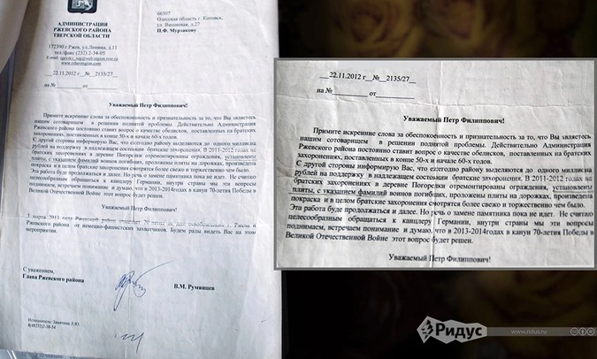 Как мы уже отмечали выше, в телефонной беседе Румянцев поведал корреспонденту «Ридуса», что «это (захоронения в Погорелках. — прим. „Ридус“) происходило до тех пор, пока в 2011 году по просьбе родственников солдат там захороненных не было отремонтировано братское захоронение».