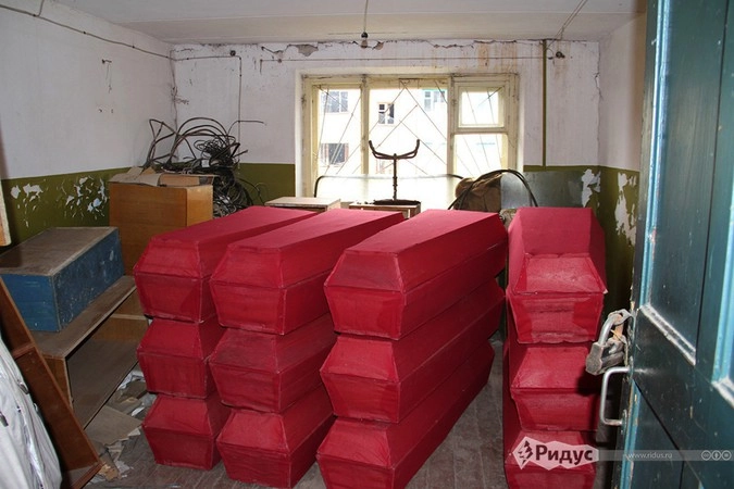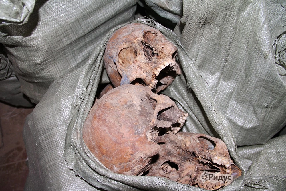 В ожидании захоронения останки советских воинов лежат часть в гробах, купленных на средства Морозовых, частью в мешках