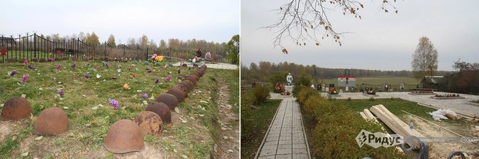 На фото слева — братская могила в Погорелках, в которой захоронено 604 человека. На фото справа — газон на кладбище, площади которого вполне бы хватило еще на одну братскую могилу.