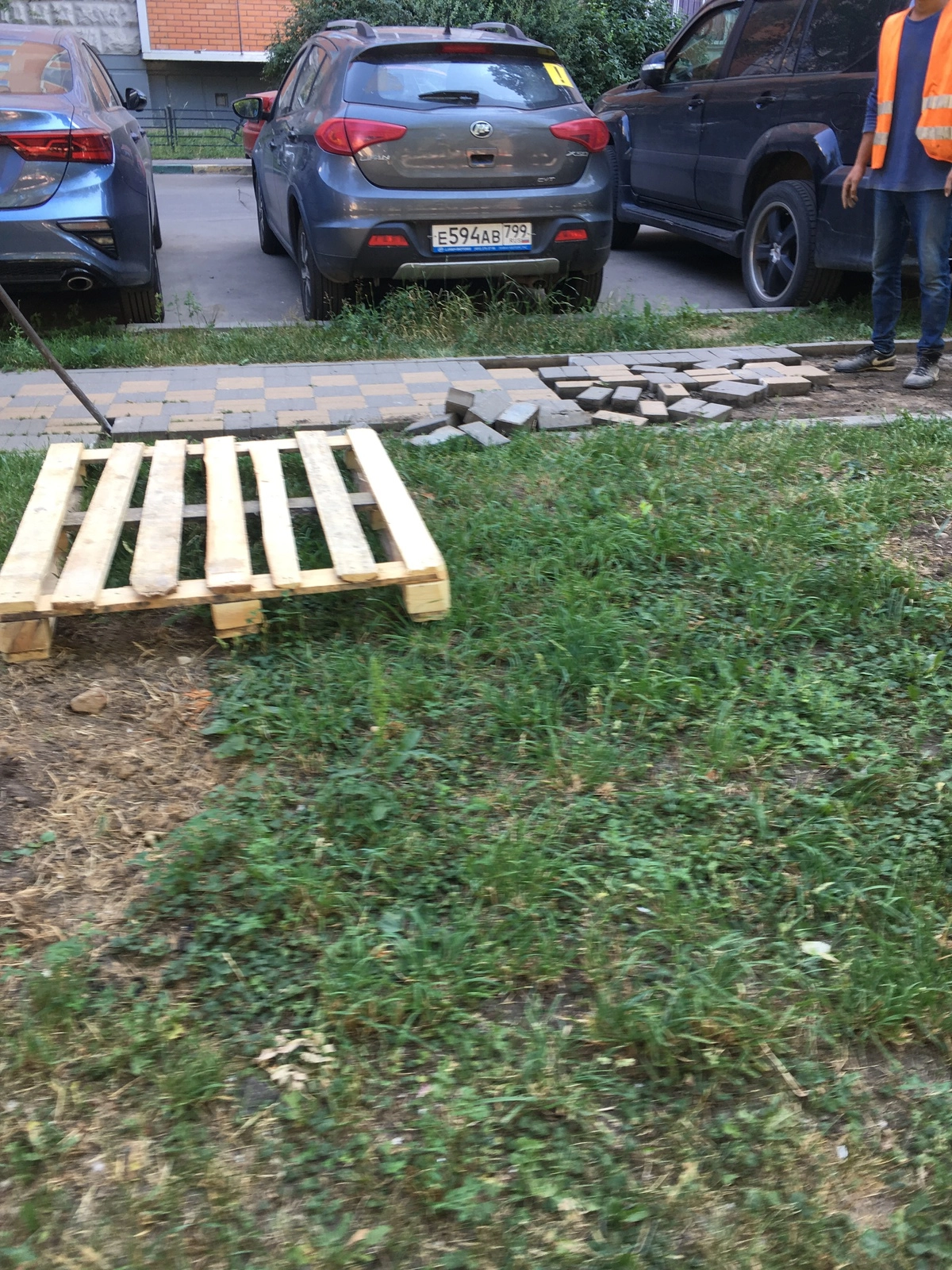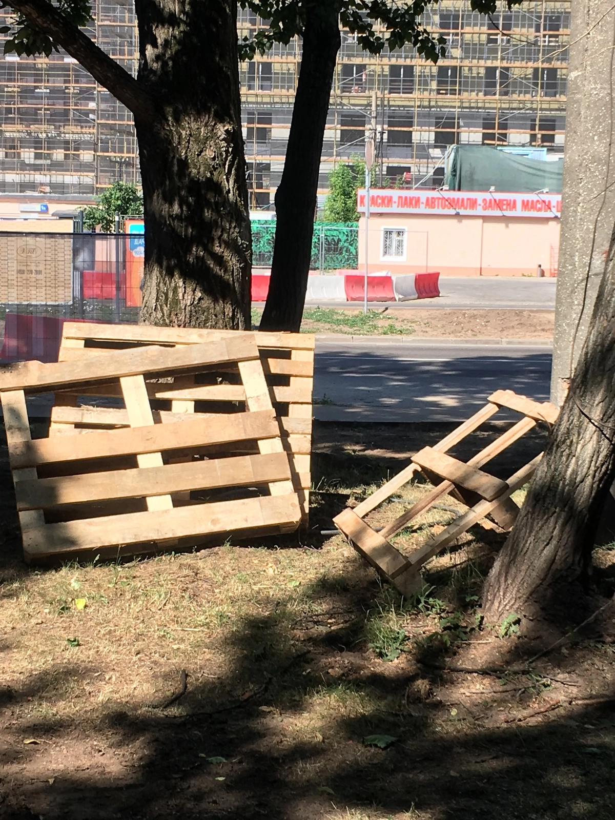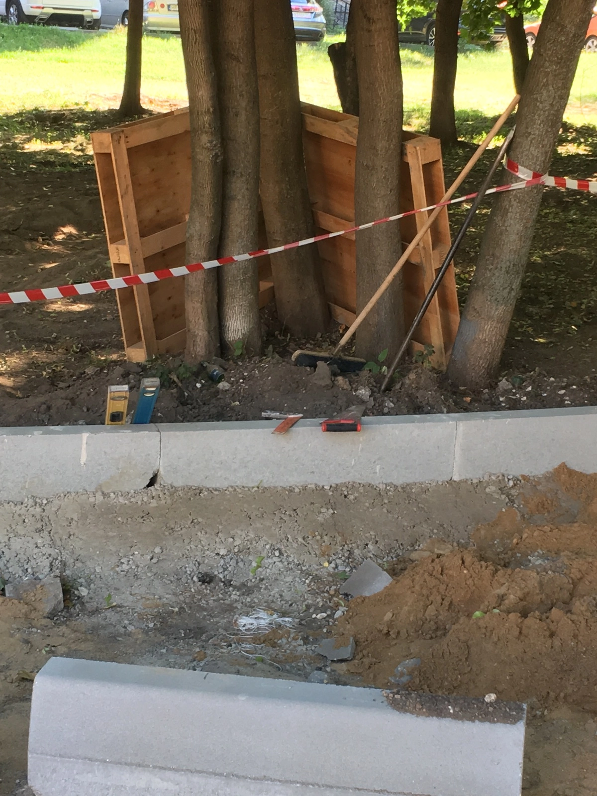 То есть, заранее коробы подготовлены не были, используют освободившиеся поддоны от новеньких бордюров. «Короб» — это теперь прислоненный к стволу, не важно с какой стороны, поддон, а можно и к фонарному столу приложить. Нам сказали — мы сделали, времени нет на такую ерунду.