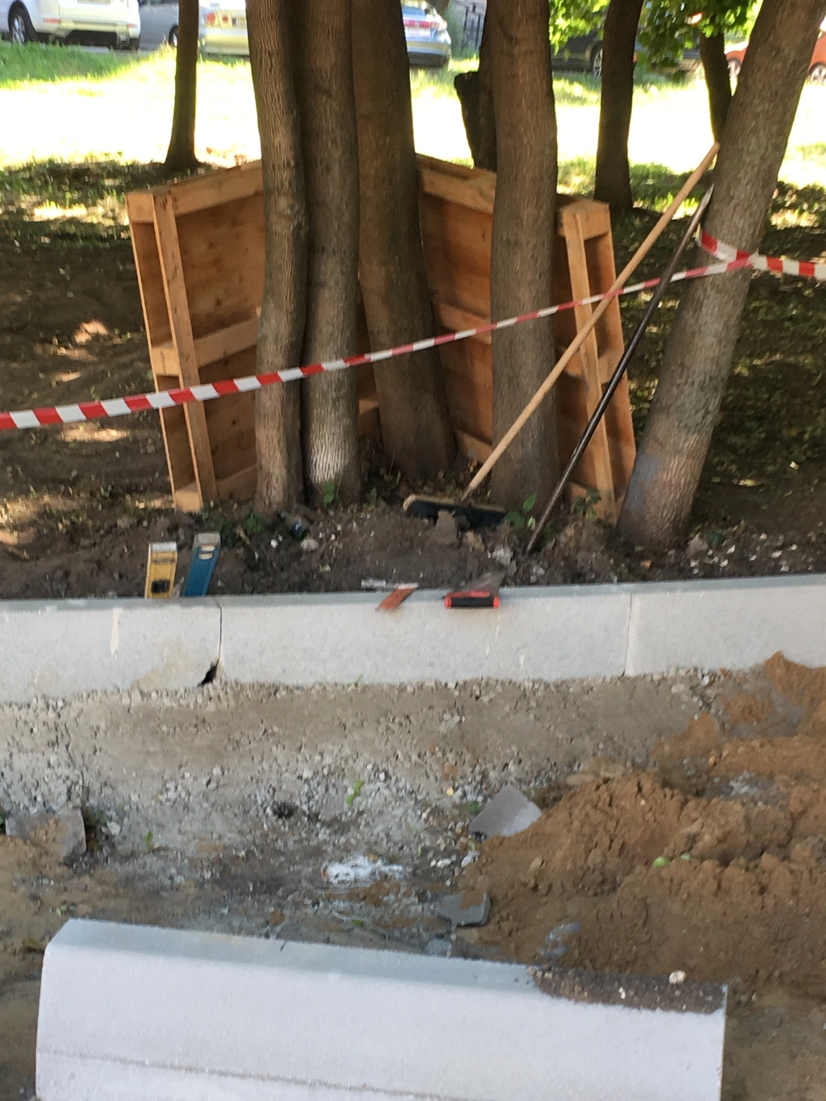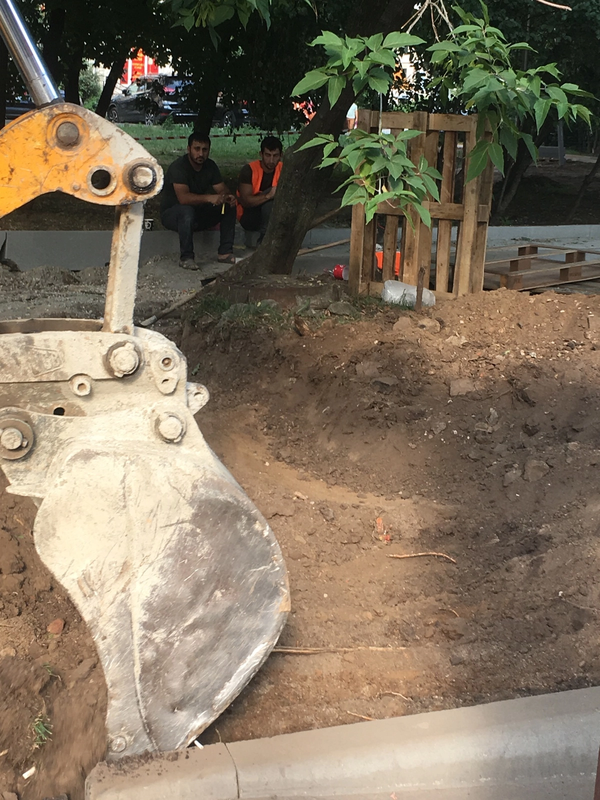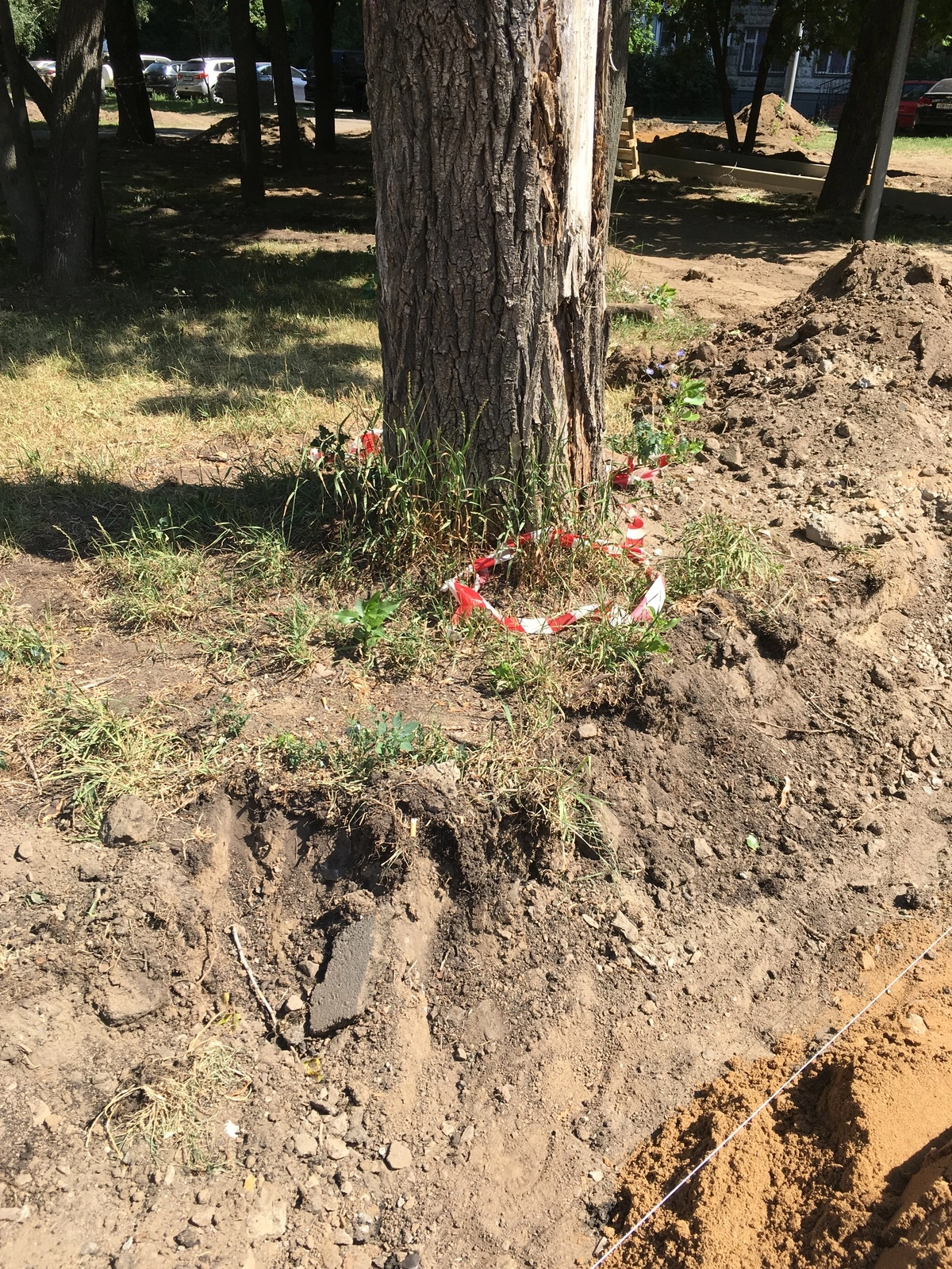 При строительных работах деревья полагается защищать деревянным коробом. Но кого это волнует. Мы же важное дело делаем, а вы тут с глупостями. Виктор Кроль потребовал защитить деревья. Да нате вам, ответили производители работ.