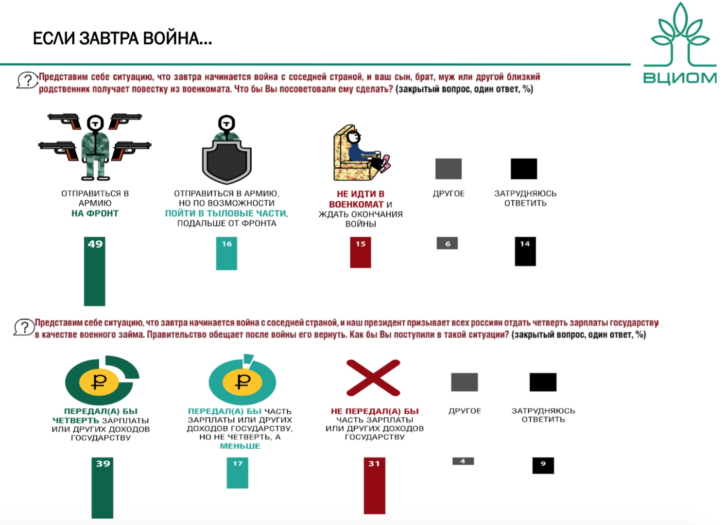 Изюминкой опроса стала тема возможной войны. Две трети россиян (65%) признались, что поддержат своих близких, если они решат отправиться на войну. На сайте ВЦИОМ полная формулировка вопроса звучит так: «Представим себе ситуацию, что завтра начинается война с соседней страной, и ваш сын, брат, муж или другой близкий родственник получает повестку из военкомата. Что бы Вы посоветовали ему сделать?»