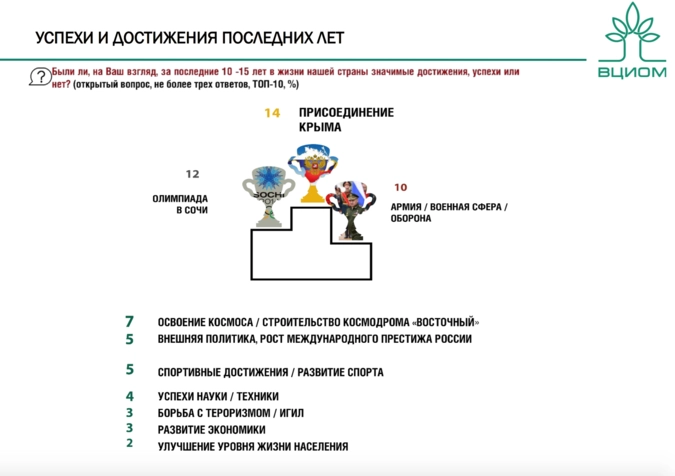 В приложении к опросу ВЦИОМ дает большую презентацию исследования российского патриотизма как национальной идеи и практики. В документе говорится, что большинство россиян считают главным достижением России возвращение Крыма. На втором месте — Олимпиада в Сочи, на третьем — успехи российской армии. Сильная армия также попала в тройку лидеров в условной номинации «Гордость россиян». Также население гордится историей, культурой и наукой в своей стране. ВЦИОМ отмечает, что за три года проценты значительно выросли и составляют 88−90%. А среди личностей, которыми могла бы гордиться наша страна, россияне назвали Владимира Путина, Сергея Шойгу и Сергея Лаврова.