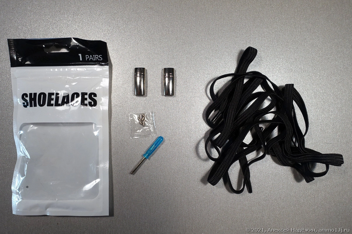 В комплекте два метровых эластичных шнурка (можно выбрать один из множества цветов), два замка, семь винтиков (три запасных) и маленькая отвёртка.