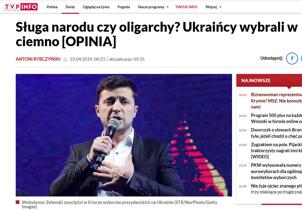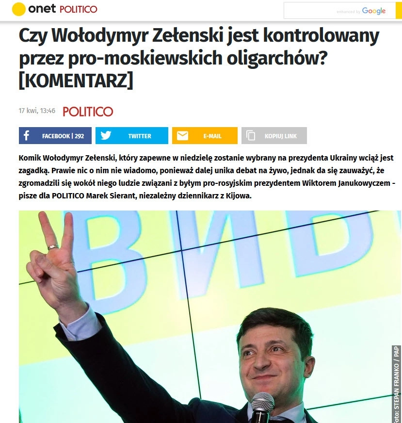 Накануне второго тура выборов на страницах популярного издания Onet.pl вышла статья под заголовком «Контролируется ли Владимир Зеленский промосковскими олигархами?», на страницах которой политолог Марек Серант обращает внимание на то, что за спиной комика можно найти «старых добрых знакомых», известных «активной поддержкой свергнутого пять лет назад промосковского президента Виктора Януковича».