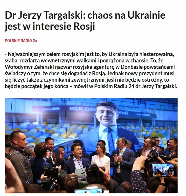 Главная цель России заключается в том, чтобы сделать Украину неуправляемой, слабой, раздираемой внутренними конфликтами и погруженной в хаос. То, что Владимир Зеленский назвал российскую агентуру в Донбассе повстанцами, свидетельствует о том, что он хочет договориться с Россией. Однако новый президент должен считаться и с внешними факторами, если он не будет осторожен, то это будет началом его конца, — подчеркнул он в интервью Polskie Radio 24.