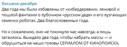 В Telegram-канале «Восьмое декабря» была опубликована даже развёрнутая ругательная рецензия на ещё не вышедший сериал, в которой оригинальные ролики были названы «ленивой и пошлой лубочной фантазией». Автор канала проводит мысль, что в эпоху настоящих российских успехов в цифровизации всего на экране не место «клюквенной фантазии о дедах в ватниках, напичканной мемами с „Пикабу“».