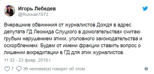Зампредседателя Госдумы Игорь Лебедев, который также является депутатом ЛДПР и сыном Владимира Жириновского, заявил о желании лишить аккредитации журналистов издания, распространивших эти сведения.