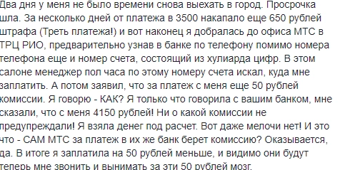 Таким образом, из-за этой бумажной волокиты она не смогла вовремя оплатить кредит, а со следующего дня у нее пошла просрочка по долгу. Больше всего клиентку поразило то, что МТС за платеж в их же банк берет комиссию в размере 50 рублей.
