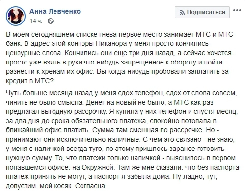 По словам Левченко, месяц назад она решила купить мобильный телефон в рассрочку в магазине МТС. И за два дня до срока обязательного платежа начались ее многочисленные злоключения.