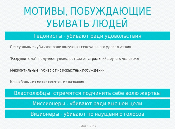 На преступление «серийников» толкают разные желания. Мотивы, побуждающие убивать людей, также подверглись классификации. По этому признаку маньяков делят на 4 основные группы: гедонисты, властолюбцы, миссионеры и визионеры.