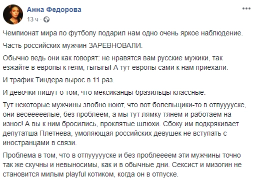 Колумнист Анна Федорова взбудоражила интернет своим интересным наблюдением за поведением российских мужчин. По ее словам, они приревновали россиянок к приезжим иностранным болельщикам.