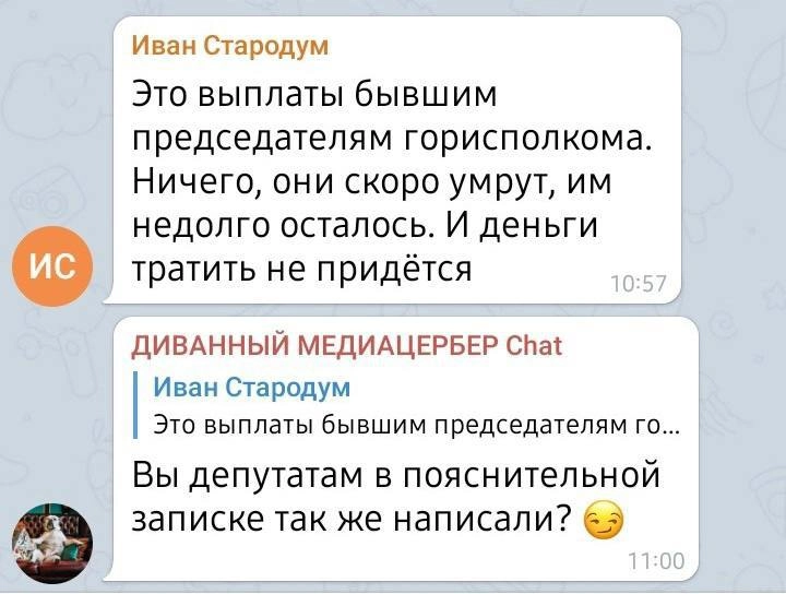 Это выплаты бывшим председателям горисполкома. Ничего, они скоро умрут, им недолго осталось. И деньги тратить не придется, — заявил «Стародум».