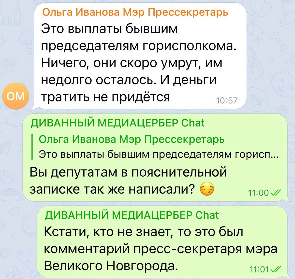 Вскоре после того, как решение было принято, в Telegram-чате «Медиацербера» возник некий Иван Стародум, который попытался объяснить, для каких целей предназначена ежемесячная выплата чинам администрации.