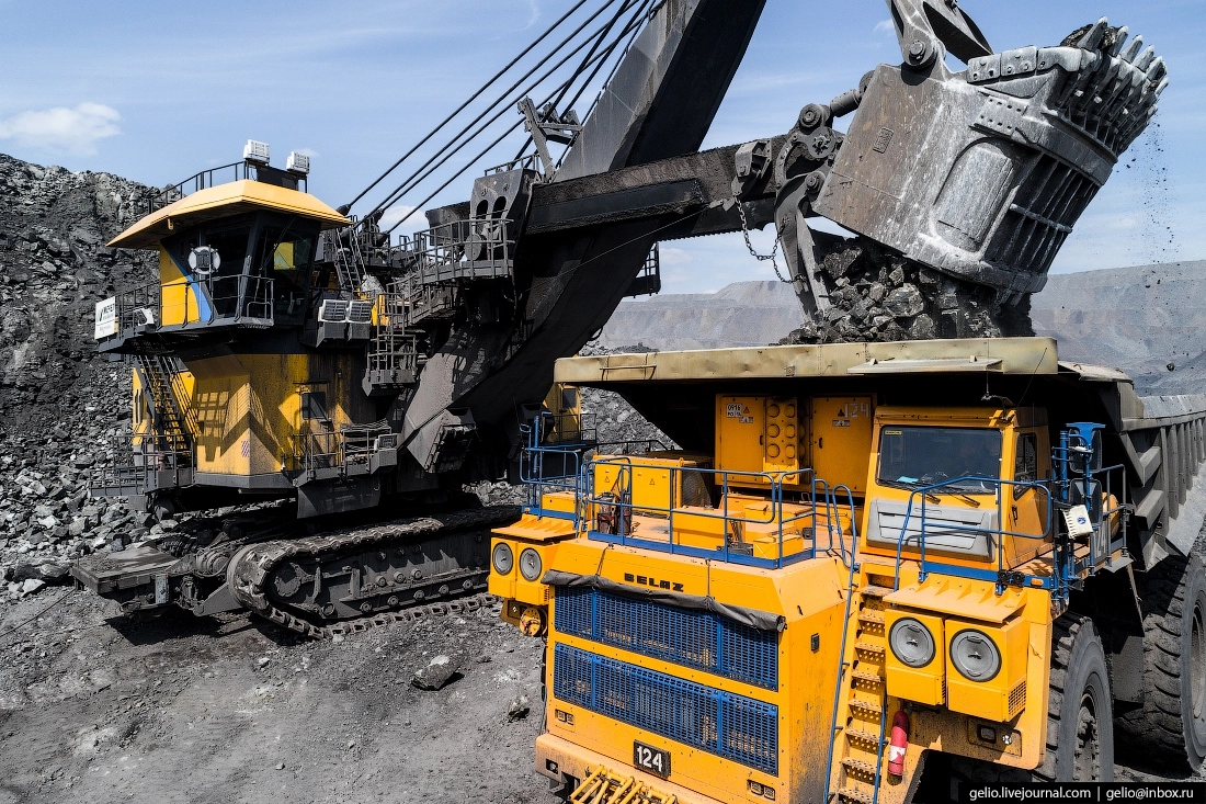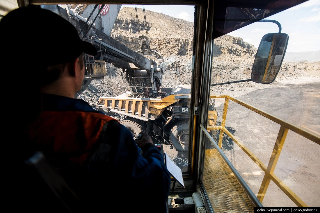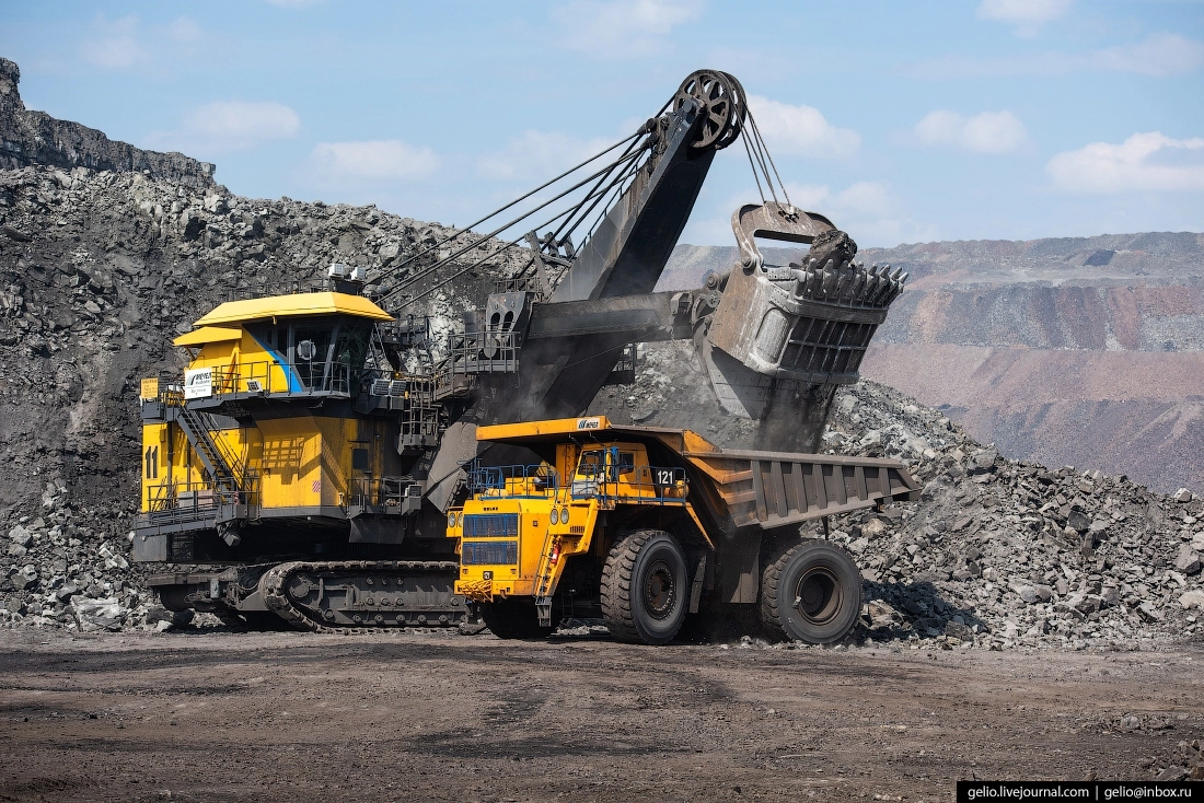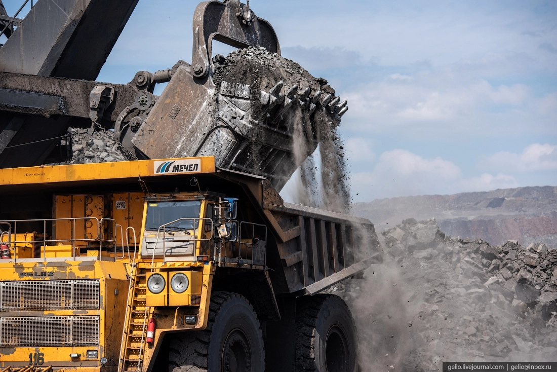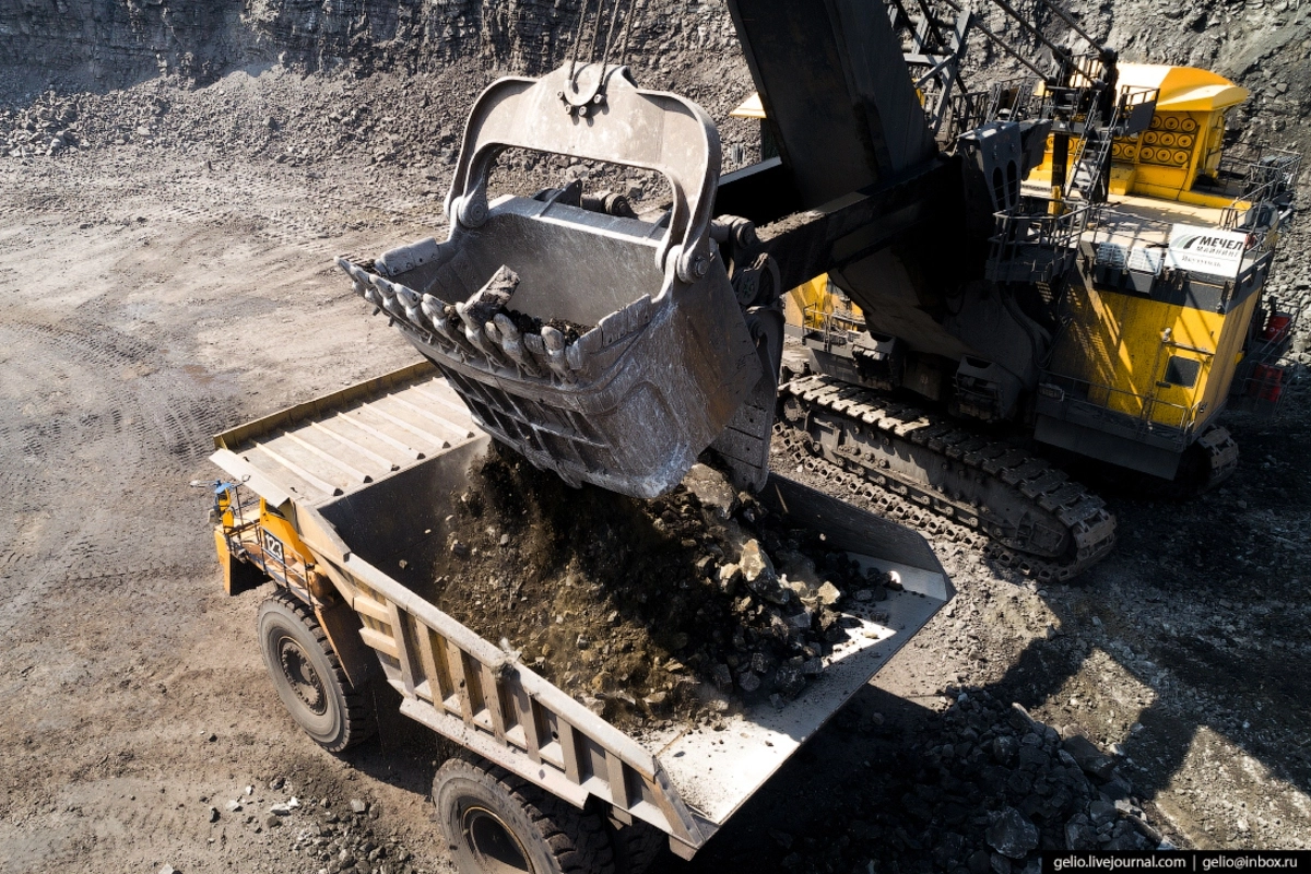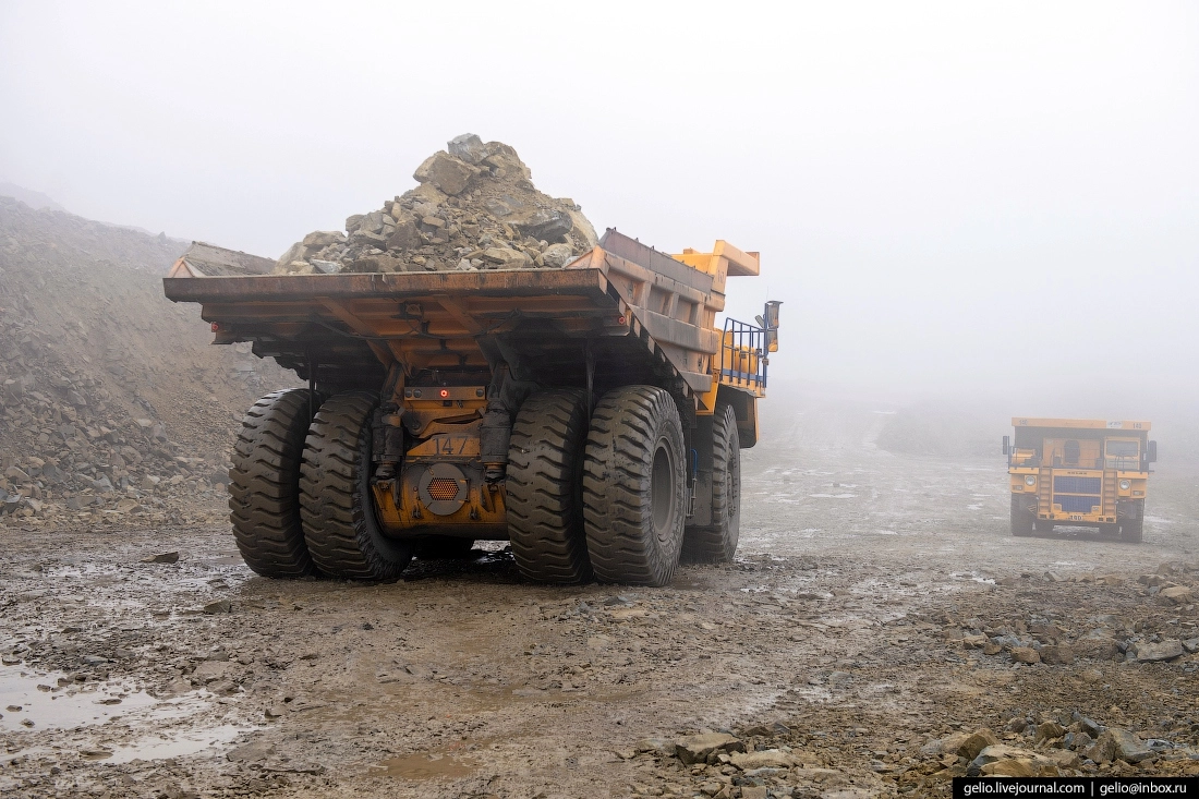Горную массу погружают в 220-тонные карьерные самосвалы с помощью мощных экскаваторов.