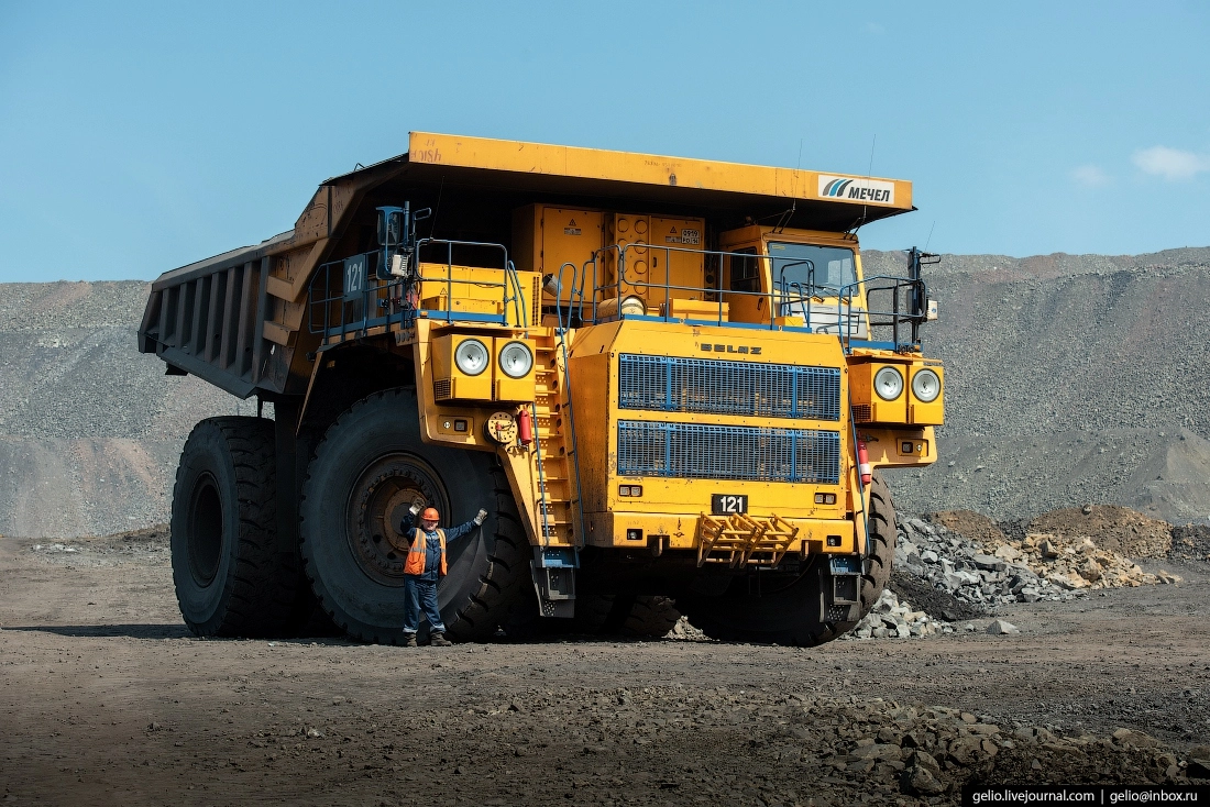 Самосвал в среднем от места погрузки (забоя) до места разгрузки (отвала) проезжает около 3,5 километра. Каждую смену из-под ковша одного экскаватора ЭКГ-18 выезжают 120 гружёных самосвалов.