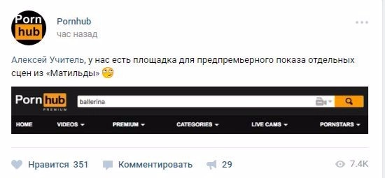 Российское подразделение PornHub предложило режиссеру Алексею Учителю устроить предпоказ некоторых сцен из его фильма «Матильда» на этом порносайте.