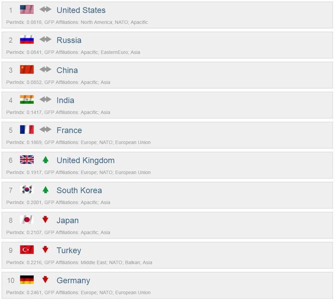 При этом в общем списке Global Firepower по всем странам мира Украина находится на 29-м месте, между Грецией и Чехией. На первом месте — Вооруженные силы США, на втором — России, на третьем — Китая. Также в десятку сильнейших военных держав мира вошли Индия, Франция, Великобритания, Южная Корея, Япония, Турция и Германия. Всего эксперты проанализировали военные возможности 136 стран мира.