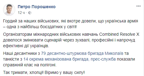 «Горд за наших военных, которые в очередной раз доказали, что украинская армия — одна из самых боеспособных в мире. Организаторам международных военных учений Combined Resolve X пришлось менять сценарий из-за дерзких, профессиональных и удивительно эффективных действий украинцев», — написал Порошенко в Facebook.