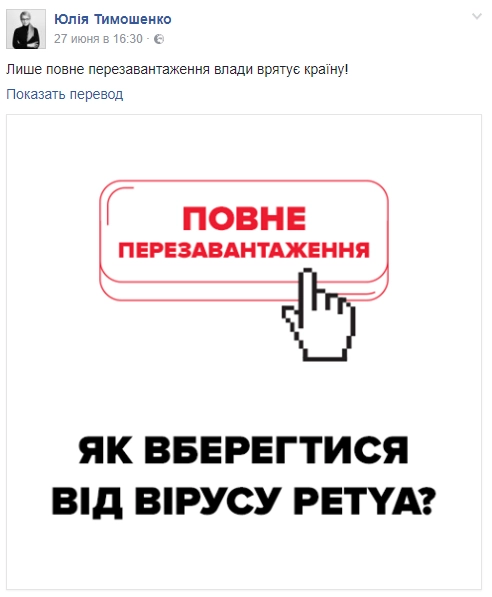 Лидер украинской оппозиционной партии «Батькивщина», бывший премьер-министр Украины Юлия Тимошенко пошутила по поводу массовых кибератак, сравнив вирус с президентом страны Петром Порошенко. Политик разместила в Facebook картинку с вопросом «Как уберечься от вируса Petya?» и тут же ответила на него: «Только полная перезагрузка власти спасет страну».