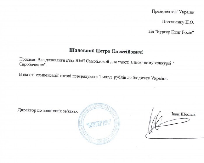 Сеть ресторанов быстрого питания «Бургер Кинг» предложила украинскому президенту Петру Порошенко миллиард рублей за разрешение на въезд в страну российской участнице конкурса «Евровидение» Юлии Самойловой.