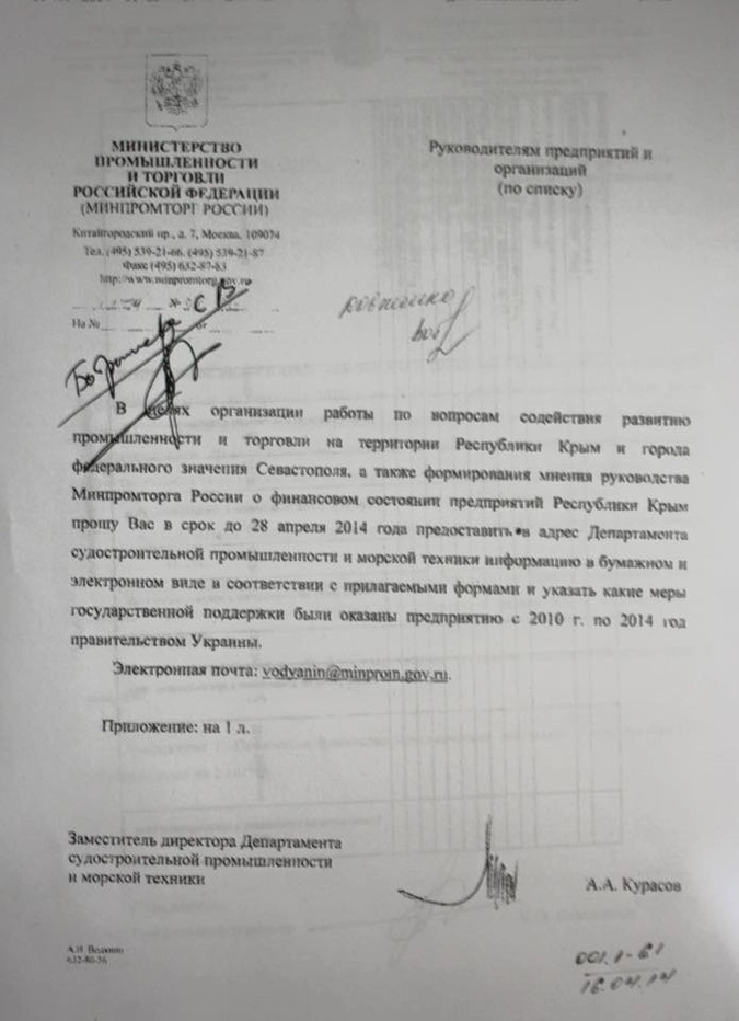 Итак, 6 апреля 2014 года, через месяц после известных событий в Крыму и Севастополе, на принадлежащий Петру Порошенко "Севастопольский морской завод" поступило письмо из Министерства промышленности России с предложением о государственной поддержке. В этом письме упоминались юридические термины, которые, трудно назвать украинскими. В частности, Севастополь именовался городом федерального значения, а Автономная Республика Крым — Республикой Крым.