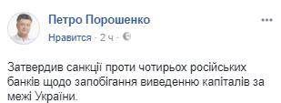 «Утвердил санкции против четырех российских банков с целью предотвращения вывода капиталов за пределы Украины», — сообщил на своей странице в Facebook украинский лидер.