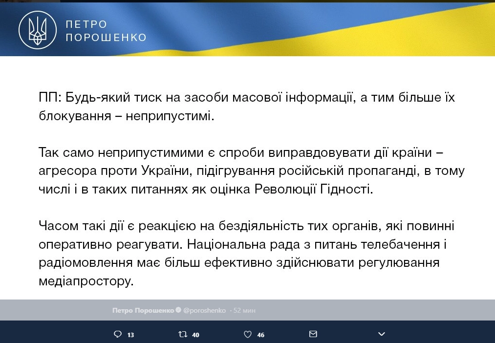 Давление на СМИ, а тем более блокировка — недопустимы, написал Порошенко в своем официальном аккаунте в Twitter.