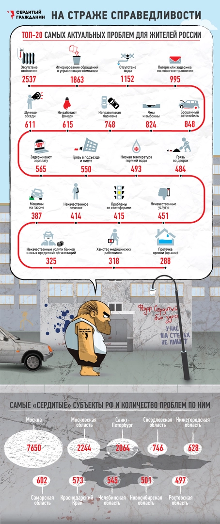 Независимый интернет-портал по решению проблем жителей России «Сердитый Гражданин» подвел итоги своей работы в 2013 году и опубликовал список 20-ти самых актуальных проблем, больше всего беспокоящих социально-активных россиян.