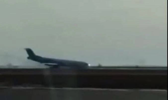 На кадрах видно, как лайнер накренился и касается поверхности земли передней частью фюзеляжа.