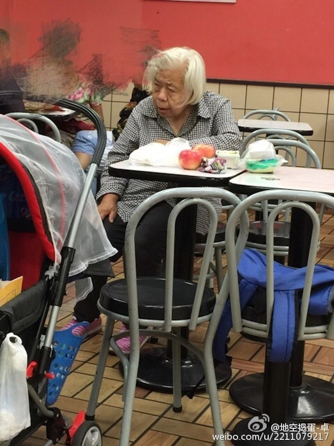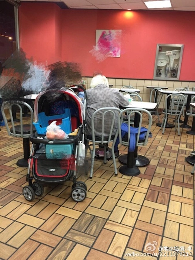 Пожилая женщина зашла в ресторан и сначала легла у стены, но никто не обратил на нее внимания, так как такое поведение типично для бездомных Гонконга. Некоторые бродяги сутками проводят время в городских кафе и закусочных.