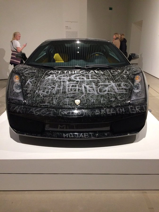 Сделали это посетители Музея изящных искусств в датском городе Орхус. Как пишет Daily Mail, именно для этих целей автомобиль и был выставлен в одном из залов музея в рамках выставки «Ни один человек не является островом». Желающих оставить свой след на поверхности дорогущего спорткара оказалось множество, люди выцарапывали свои послания даже на дисках. В процессе кто-то оторвал значок Lamborghini, а другой шутник написал слово «Skoda» — название чешской марки автомобилей.