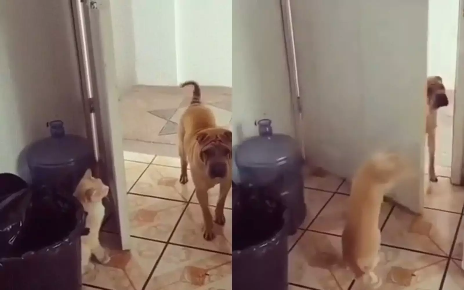 «Пошел вон!»: кот выгнал пса из дома и был очень доволен собой