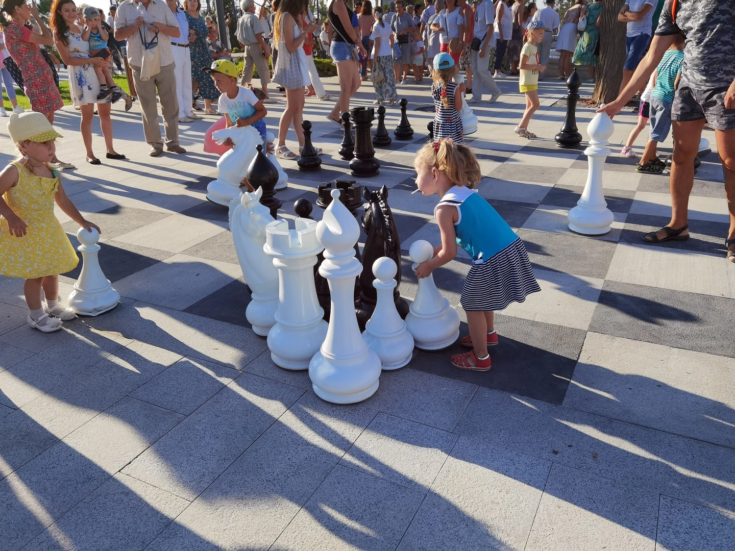 Создана также игровая площадка в виде шахматной доски с большими фигурами. Как и следовало ожидать, дети пришли от нее в восторг. Правда, они не обсуждали «вилку» или рокировку, а всего лишь играли с большими шахматными фигурами.